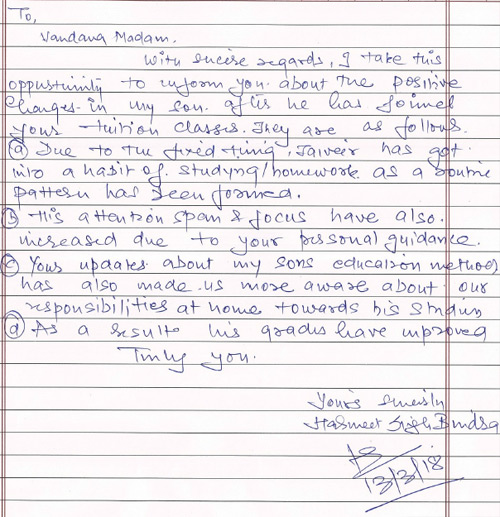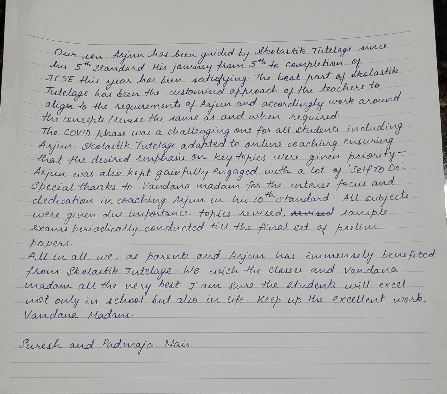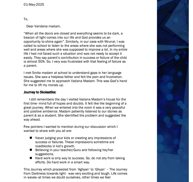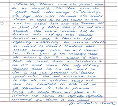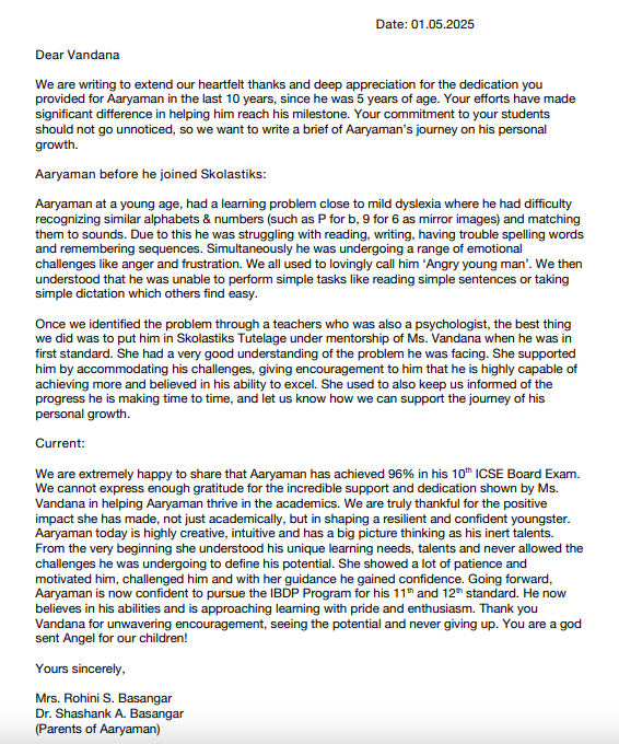 I would like to take this opportunity to thank Vandana immensely. Our entire world revolves around our children and I am fortunate that I have her in my life to guide and mentor my children. Both my sons adore her, especially the elder one always looks up to her for guidance even now after he left Skolastik Tulelage a year back after his 10th standard.