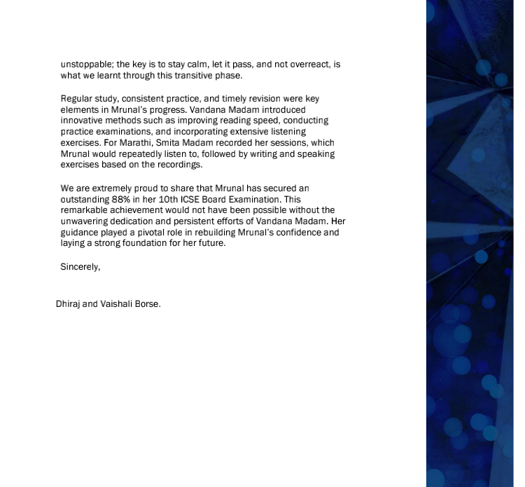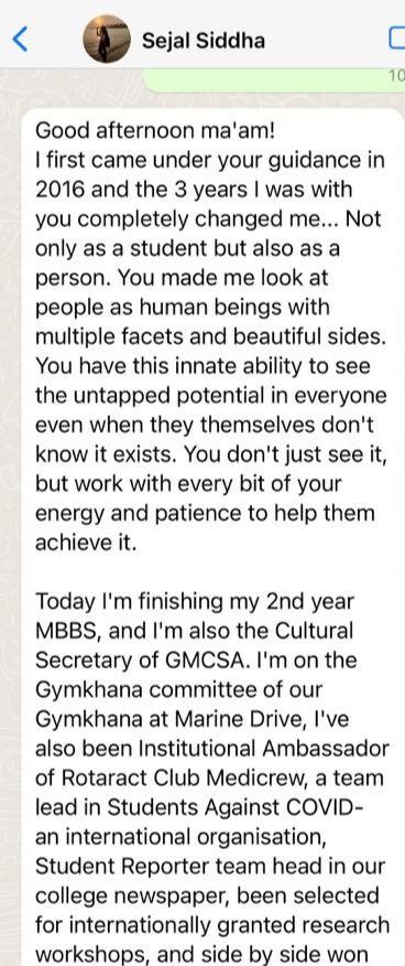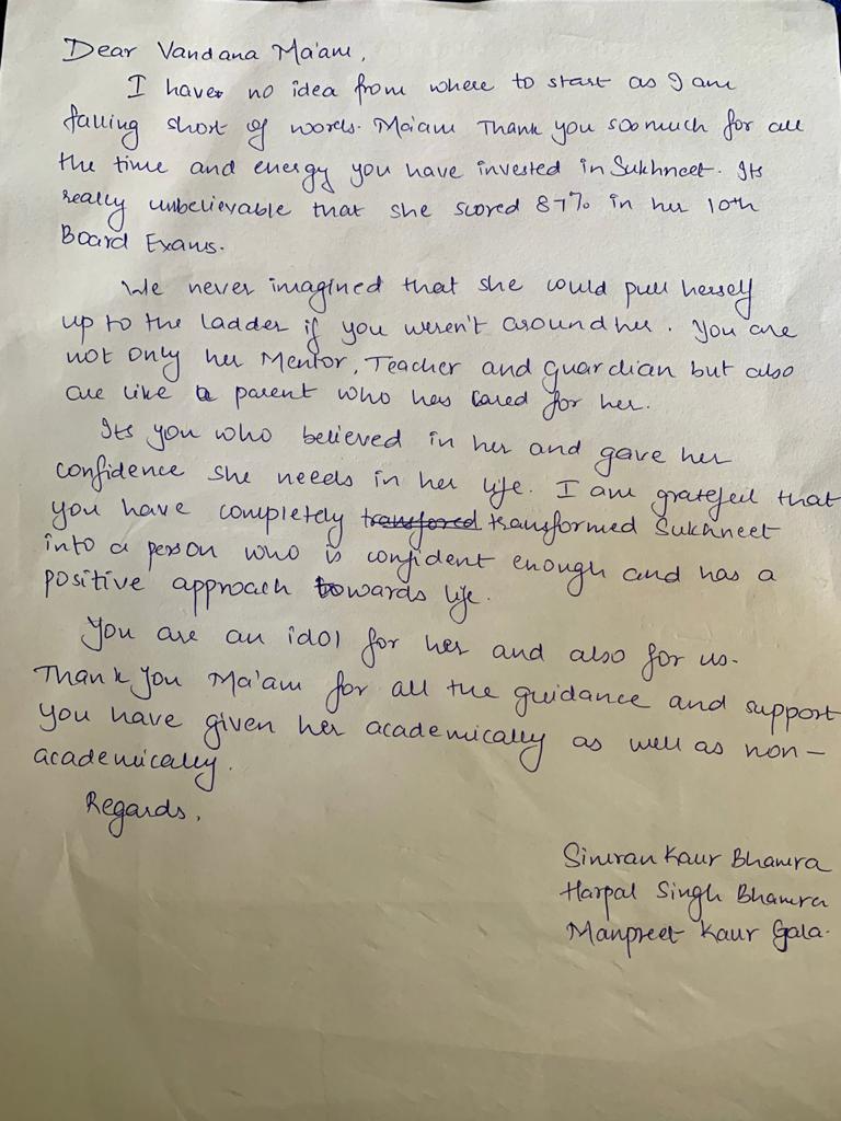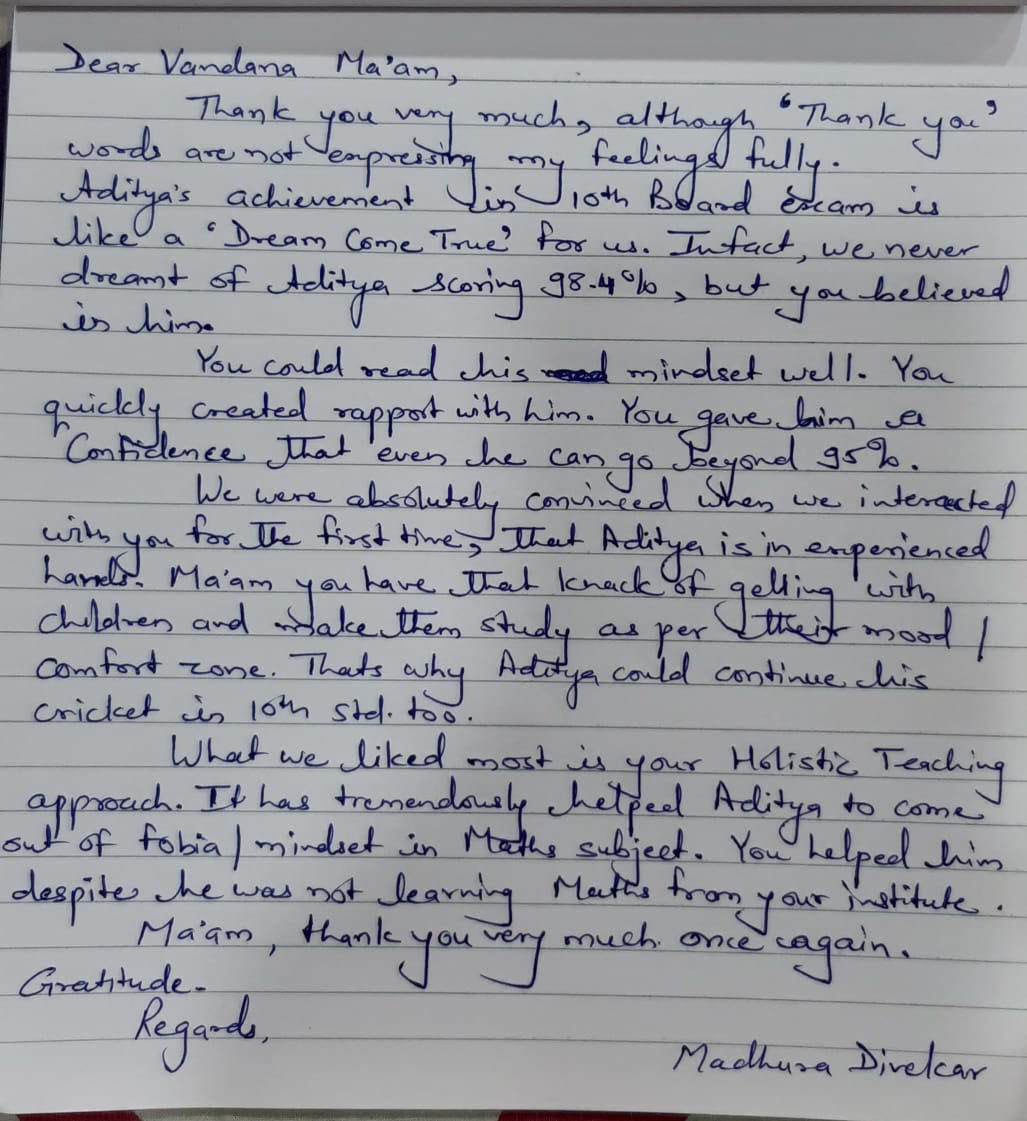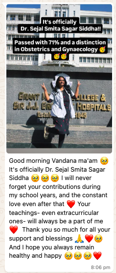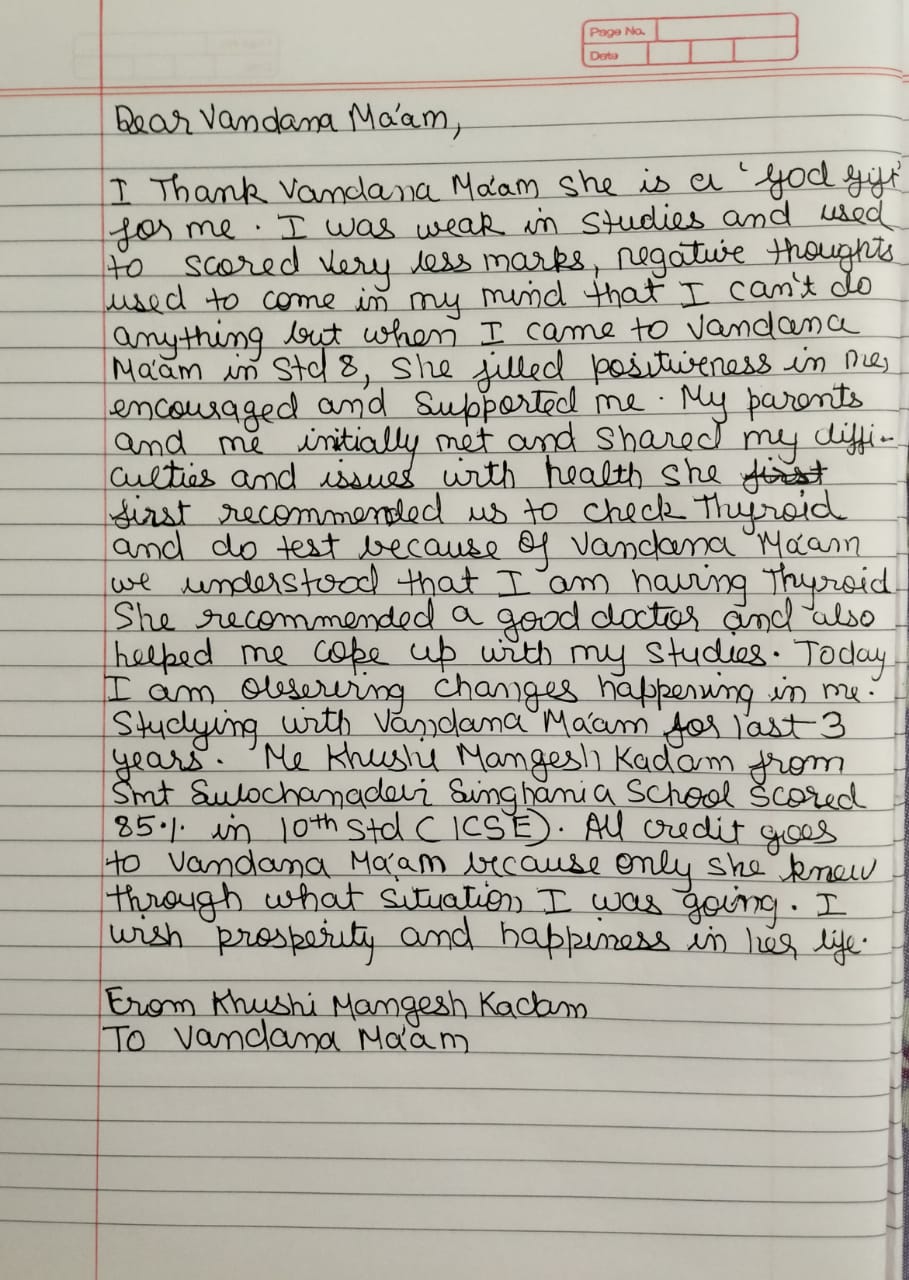 Mam always supported me and lightened my path till today, and this is how I improved in academics by scoring 87.4% in 10th. I would specially like to mention - I was very bad scoring in my subjects like geography, EVS but with EVS subject till Prelims almost clean out, but Vandana Mam literally sat by me and made me do the subject she kept motivating me I can do and made me do it and finally when I scored 87 /100 in Board and top in subject in class it was unbelievable.