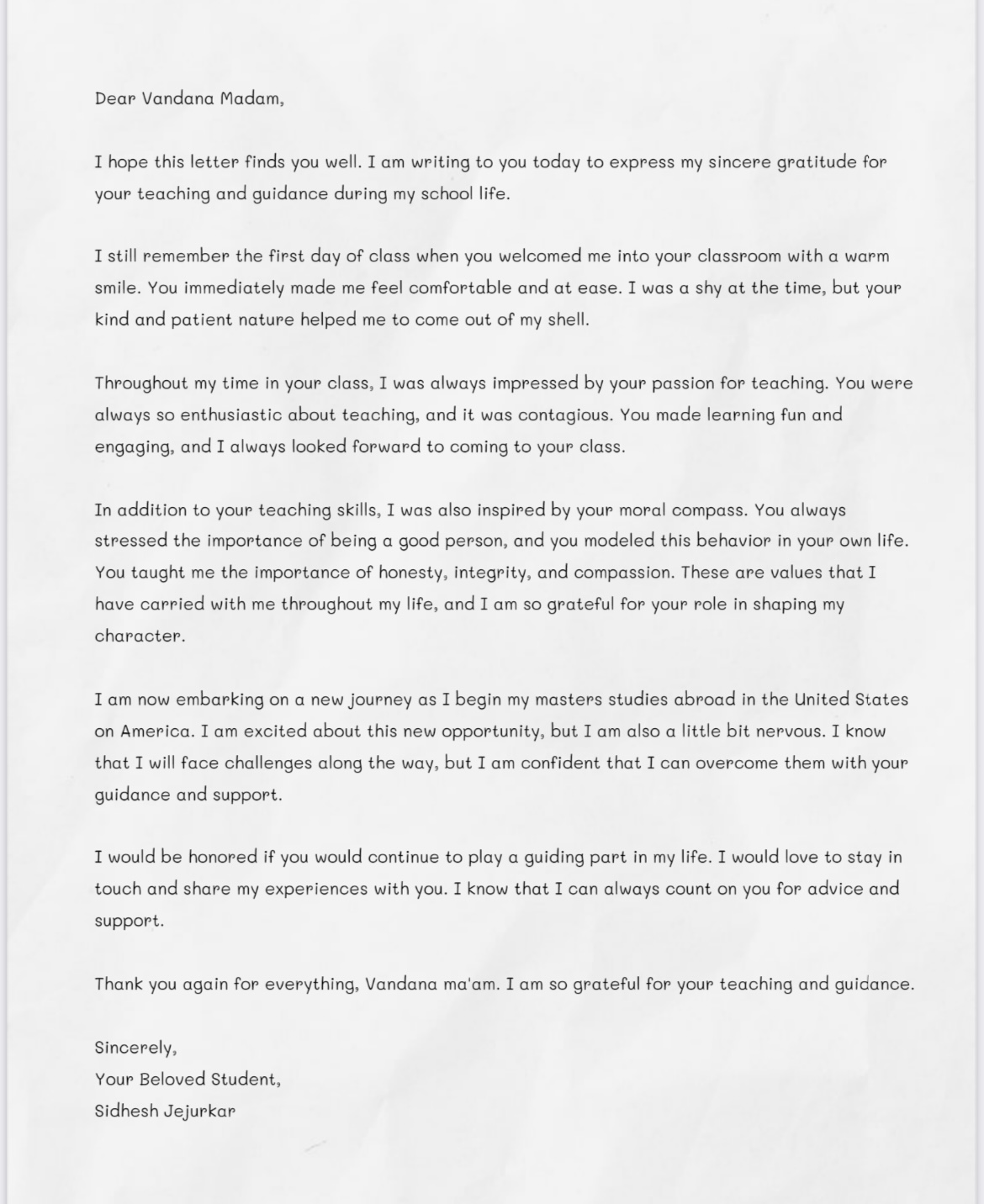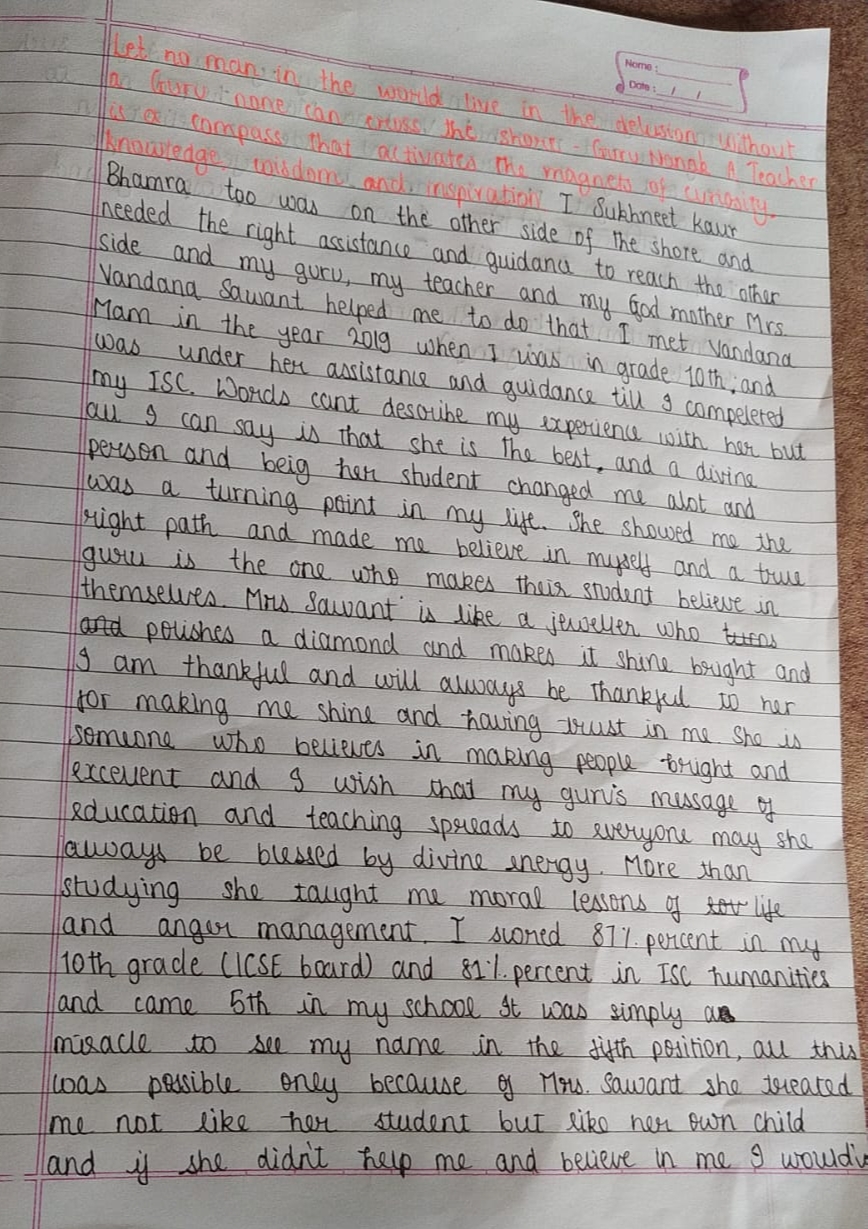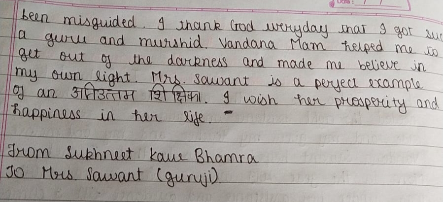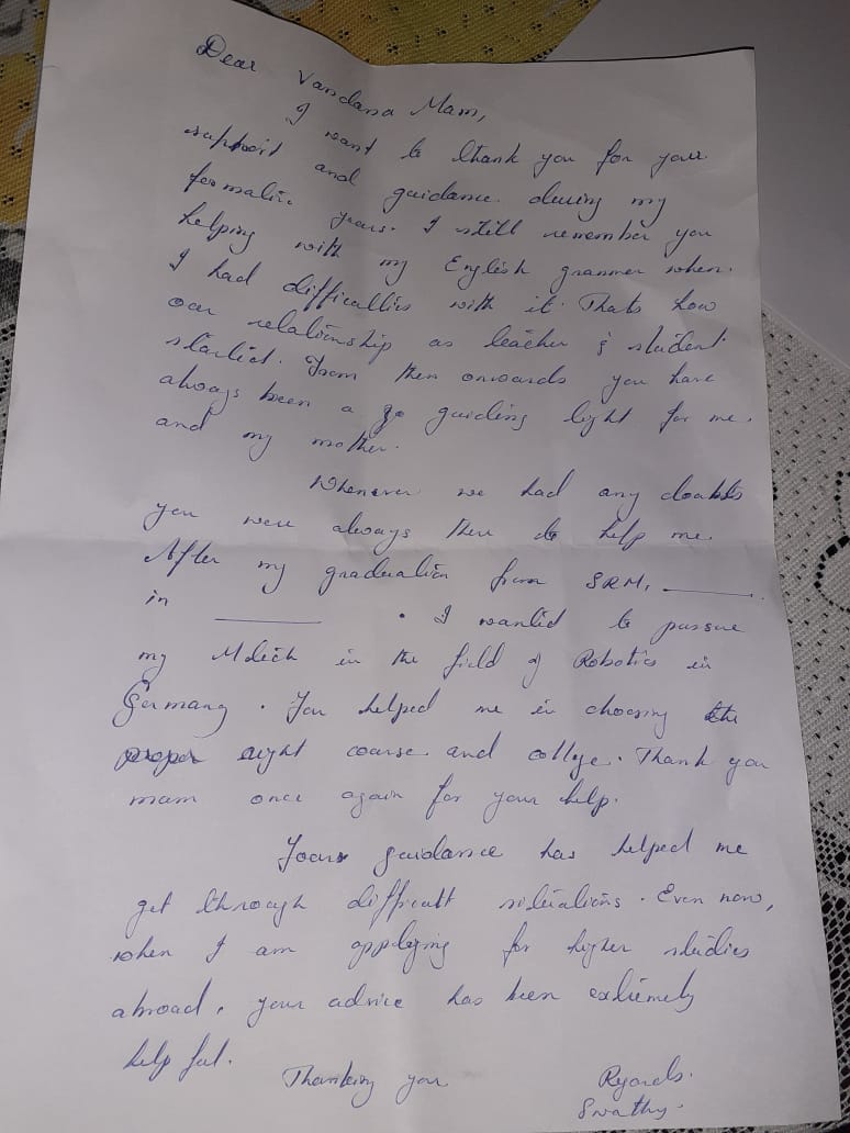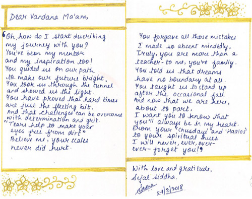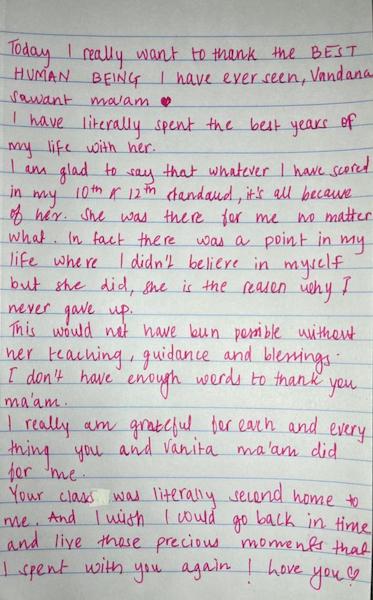 I am extremely grateful to Vandana Mam for building confidence within me. An inspirer. An empower. An engager these three characteristics are just a small sample of the many Mam demonstrated with all of students every single day.