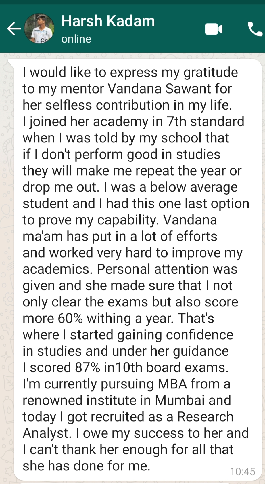 During my school days I had phobia of exams. Every night before the exam I used to panic thinking that I would black out in the middle of paper or I would fail this exam. During this period vandana miss helped a lot by giving me small counselling sessions before exams. She used to boost my confidence , reassure me of my preparation, encouraged me ; as a result of which I scored 91.3% in 10th Board Exams. I truly am grateful to Skolatik Tutelage for this and many more things in my life .