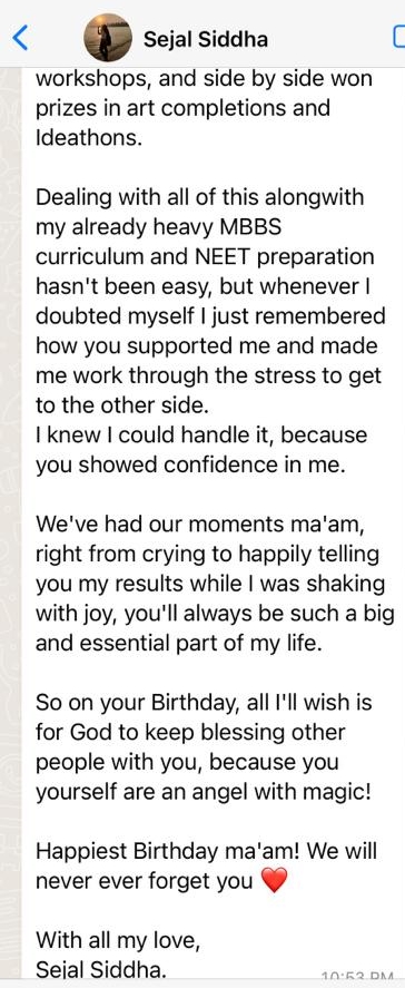 Thanks for showing faith in me and trying to make my parents believe in me. Mam you not only made me cope up with my academics but u also made me realized my caliber within. You metmorphed me from a naive girl like a caterpillar to a intelligent beautiful girl like a butterfly.